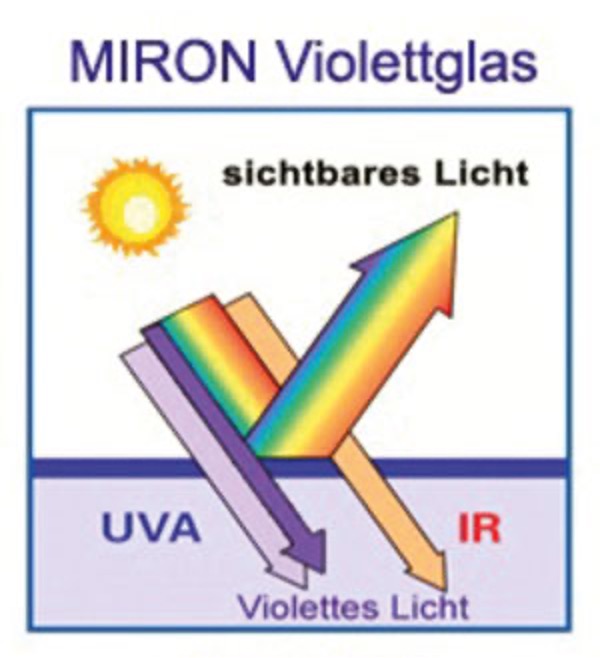 Violettglas wirkt wie ein «natürlicher» Filter. Er ist für ausgewählte Bereiche des Sonnenlichts durchlässig. Die Qualität hochwertiger und sensibler Substanzen wird durch Violettglas optimal vor Zersetzung geschützt. Die erste Qualität bleibt länger erhalten. Das Lebensmittel «lebt» länger. Damit ist es auch ein Beitrag gegen Lebensmittelverlust und für gesunde Lebensmittel. Mikronährstoffe bleiben länger aktiv und vollwertig.
